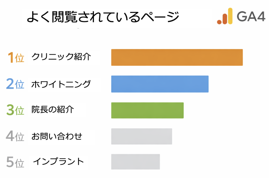 よく見られているページは、来院やコンバージョン(インターネット予約やお問い合わせ完了など)につながる可能性が高く、内部リンクや導線を工夫することで、サイト全体の成果向上が期待できます。