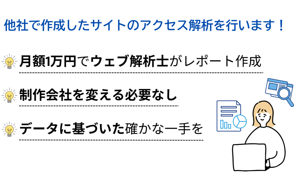 現在の制作会社を変更する必要はなく、Googleアナリティクス(GA4)などのデータをもとに、アクセス解析・レポート作成のみのご依頼も可能です。