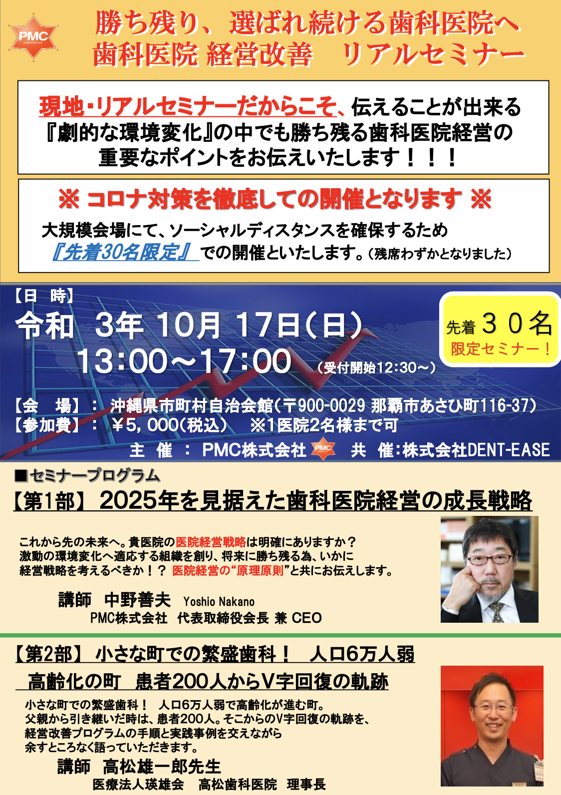 令和3年10月17日(日)にPMC株式会社による歯科医院経営セミナーが開催されます。