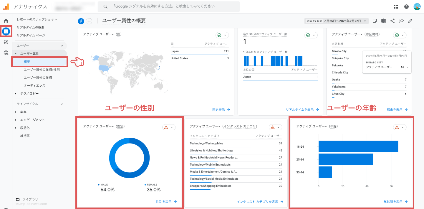 GA4には、ユーザーの年齢や性別、使用しているデバイスなどを確認できる「ユーザー属性」レポートや「テクノロジー」レポートがあります。