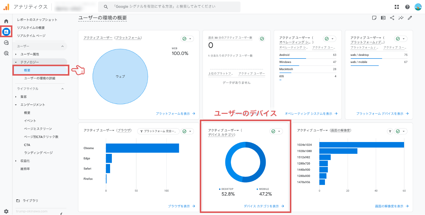 デバイスカテゴリを確認するためには、テクノロジーレポートの中の「ユーザーの環境」から見ることができます。