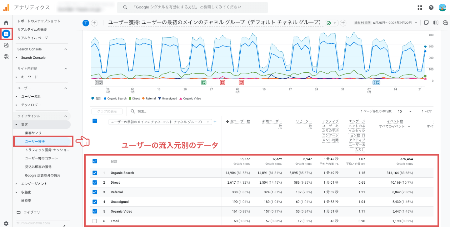 ホームページの利用者像を把握できたら、今度は「患者さんはどこから来ているのか」を見ていきましょう。「どこから」というのは、ホームページを見つけた経路のことです。例えば検索エンジンから訪れたのか、それともSNSの発信から見つけてもらったのか、あるいは最近では生成AIからのアクセスも増えてきました。