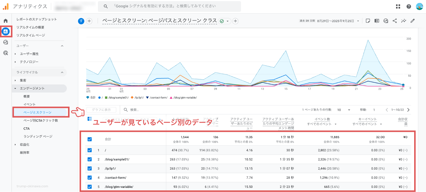 GA4には「ページとスクリーン」というレポートがあり、各ページの閲覧回数や平均エンゲージメント時間などを確認できます。ここから「よく見られているページ」「あまり見られていないページ」を把握し、どの情報に興味を持たれているのかを探るのが、行動分析の第一歩です。